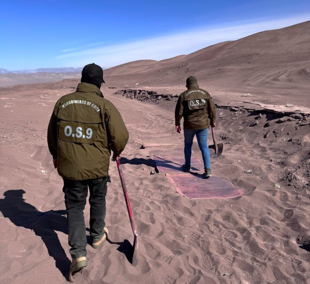 «Estas diligencias se realizaron con apoyo de la sección drone y del equipo GOPE, montando vigilancia en el lugar, procediendo a la recuperación de más de 110 láminas de cobre que se encontraban enterradas en plena pampa», complementó el efectivo policial, quien reveló que la recuperación «tiene un avalúo superior a los 80 millones de pesos«.